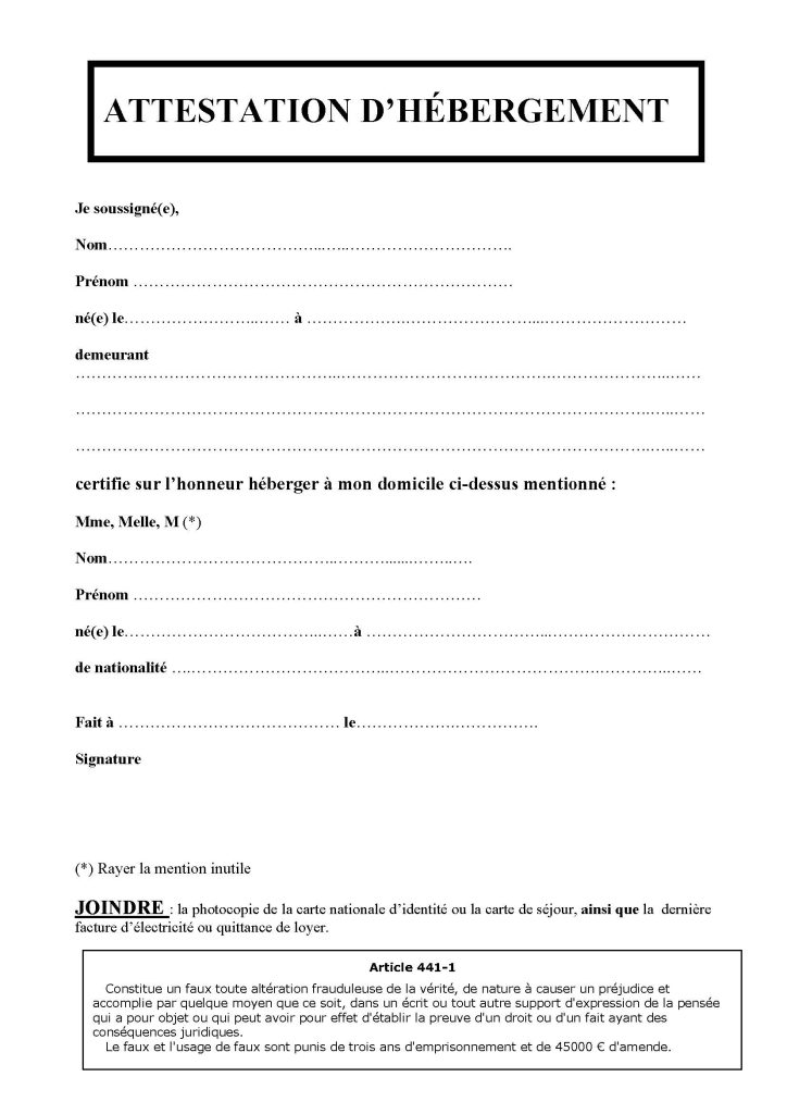 Attestation d'hébergement