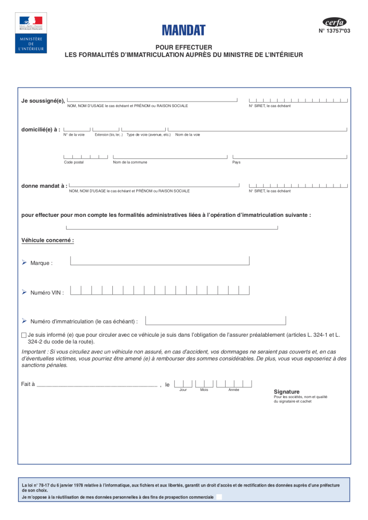 Le mandat d’immatriculation est un document officiel autorisant la société DKZ AUTO à effectuer votre changement de carte grise à votre place.