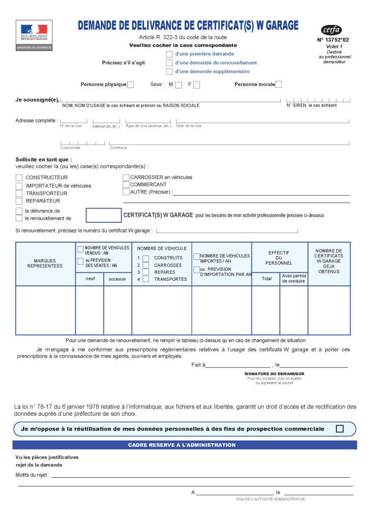 Ce document est obligatoire pour toutes demandes W garage.