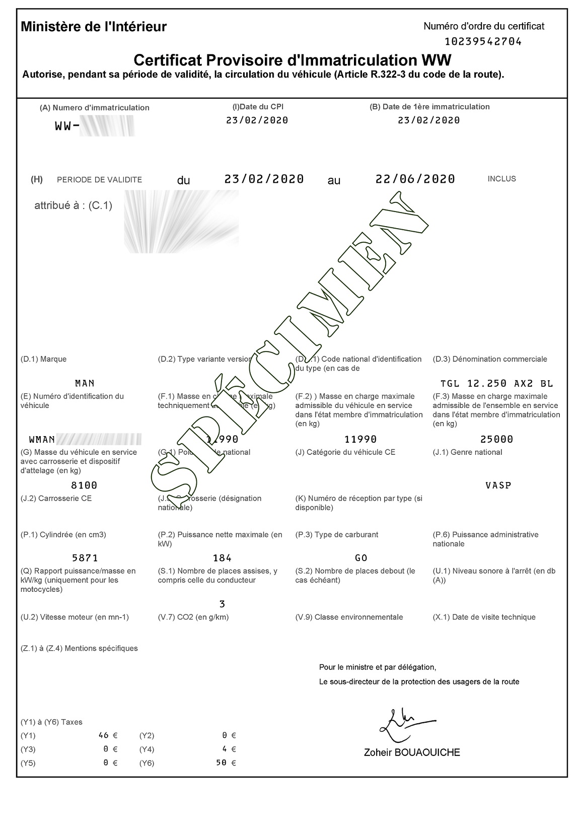 - Demande de certificat d’immatriculation (CERFA 13757*05) rempli et signé,